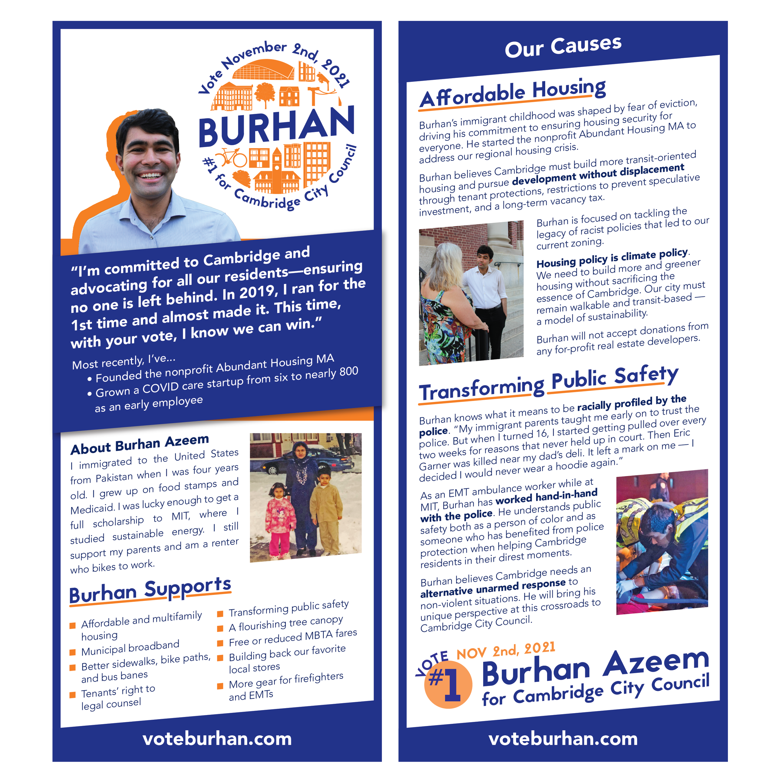 Determined to win, Burhan ran again in 2021. I redesigned his logo and materials with an emphasis on conveying trust and confidence. Burhan was finally elected to the Cambridge City Council, citing visual design, not to mention canvassing, as a key success factor.