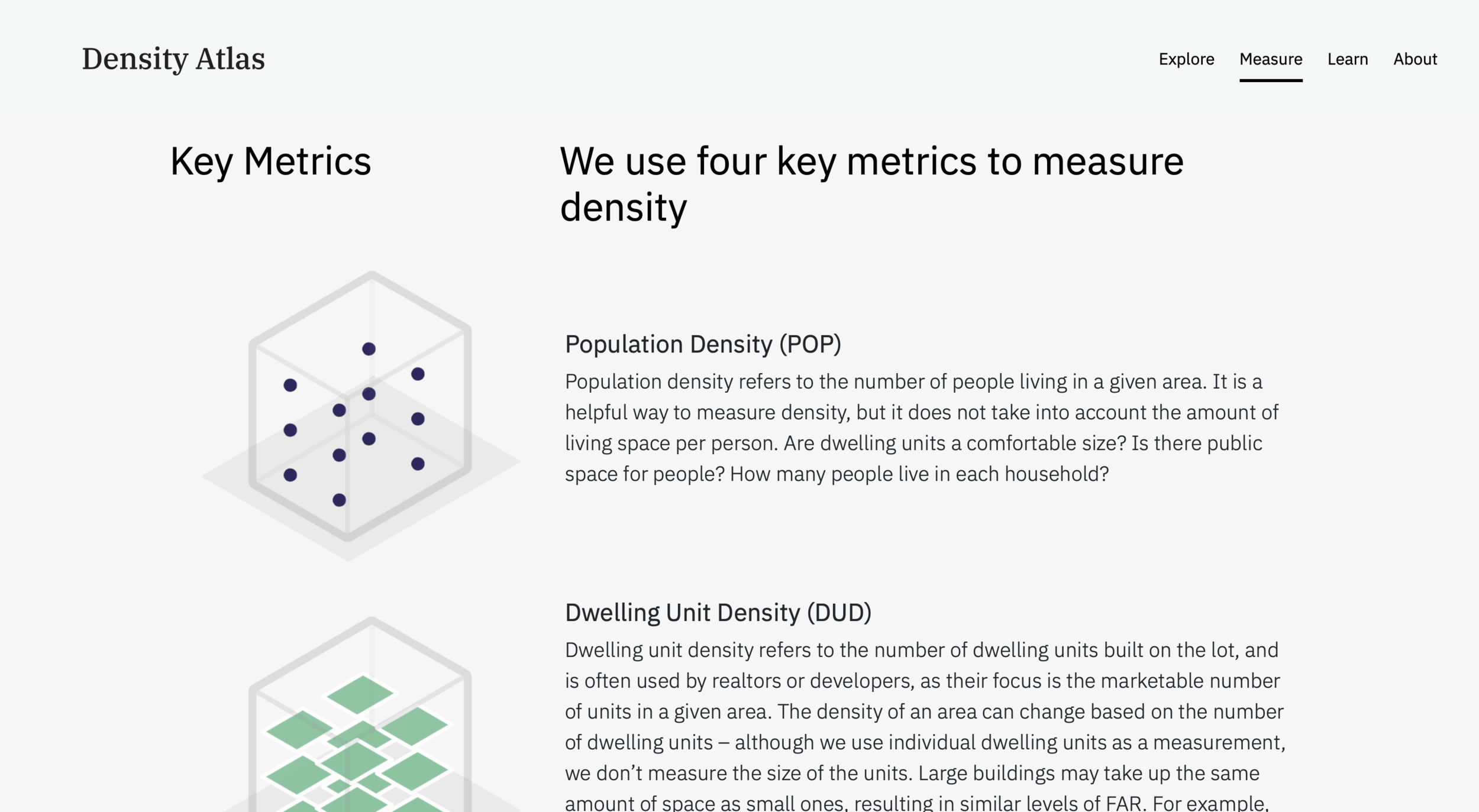 I worked on a complete redesign of the Density Atlas including UI design, content editing and updating, and an interactive 3D visualization tool for density metrics. The new site was launched in June 2021.