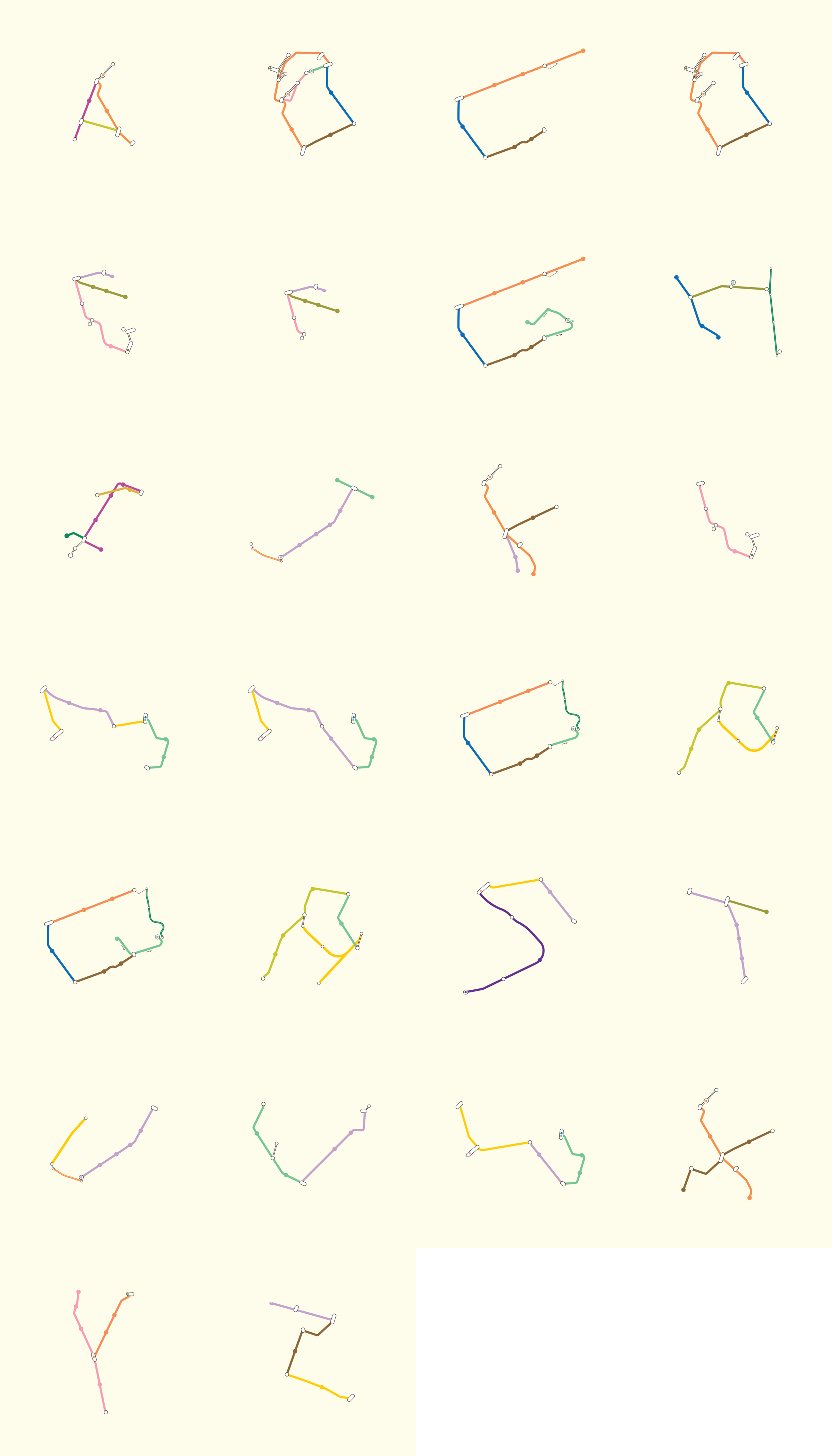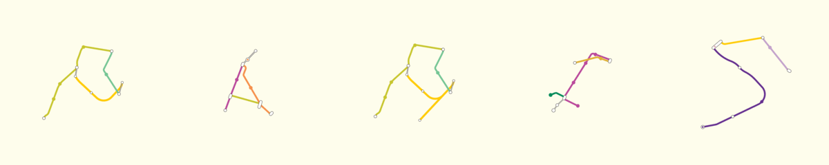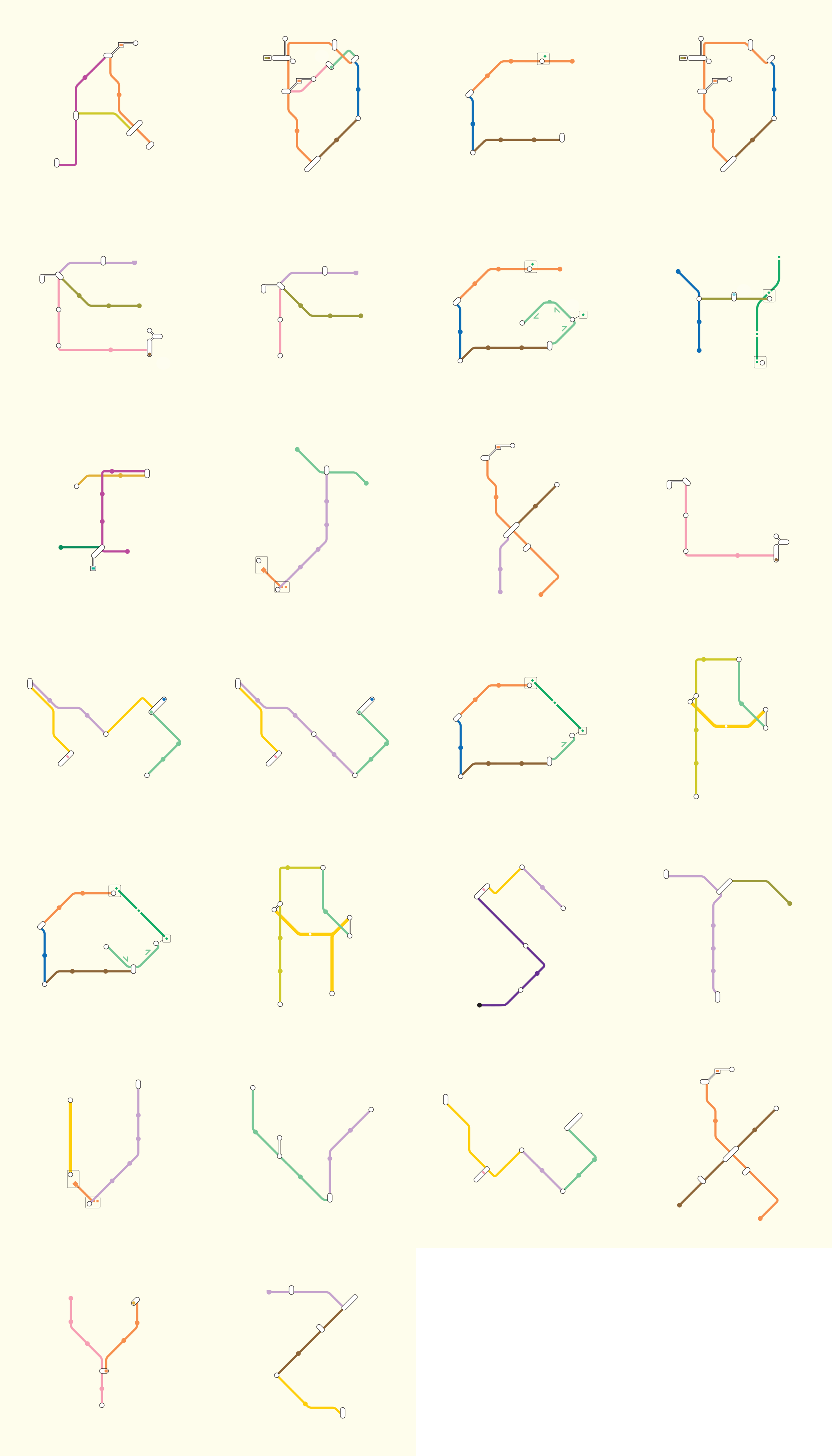 Geographically-accurate transit maps and schematic transit maps prioritize information differently. Geographic maps prioritize accuracy over legibility while schematic maps prioritize legibility over geographic accuracy. To design a schematic map, one must make decisions about what information is essential for understanding a transit system and what information can be left out. To better understand the process of schematization, I chose to compare one schematic and one geographic map of the Paris métro by creating two typefaces. Because we intuitively understand letters as more than just forms, they let us better assess legibility and information gain or loss. Completed for 4.053 - Visual Communication Fundamentals.